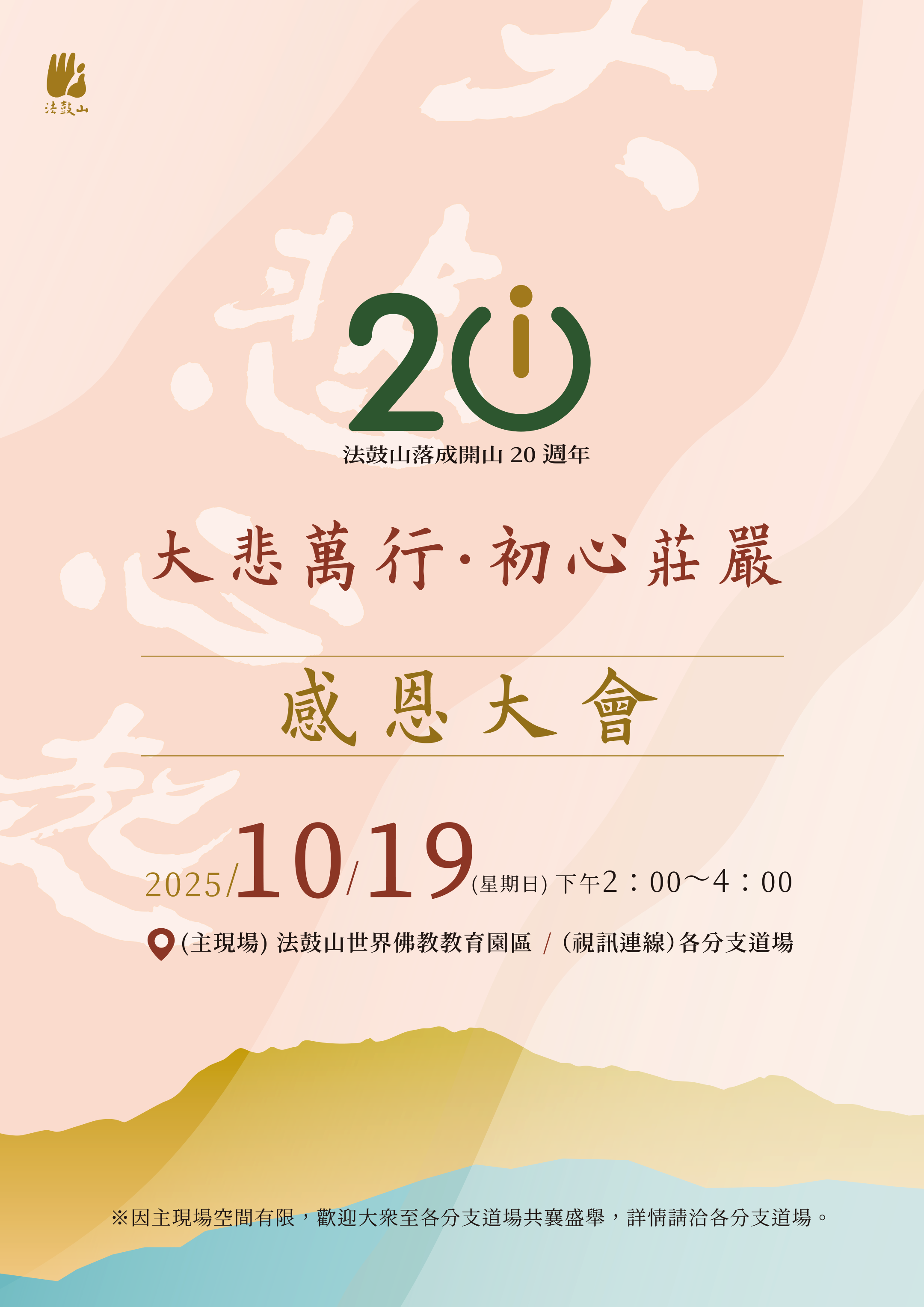 歡迎「回家」尋根,接續開山願力。法鼓山近日向全球信眾遞送「大悲萬行‧初心莊嚴─感恩大會」的邀請,邀請大眾共同參與、響應法鼓山世界佛教教育園區落成開山20週年的相關活動;感恩大會訂於2025年10月19日下午2點至4點,由於會場空間有限,歡迎各地信眾就近前往法鼓山各分支道場同步連線,共襄盛舉。