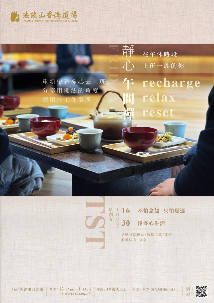 活動包括: 放鬆引導/禪坐、禪食、聆聽法音、分享