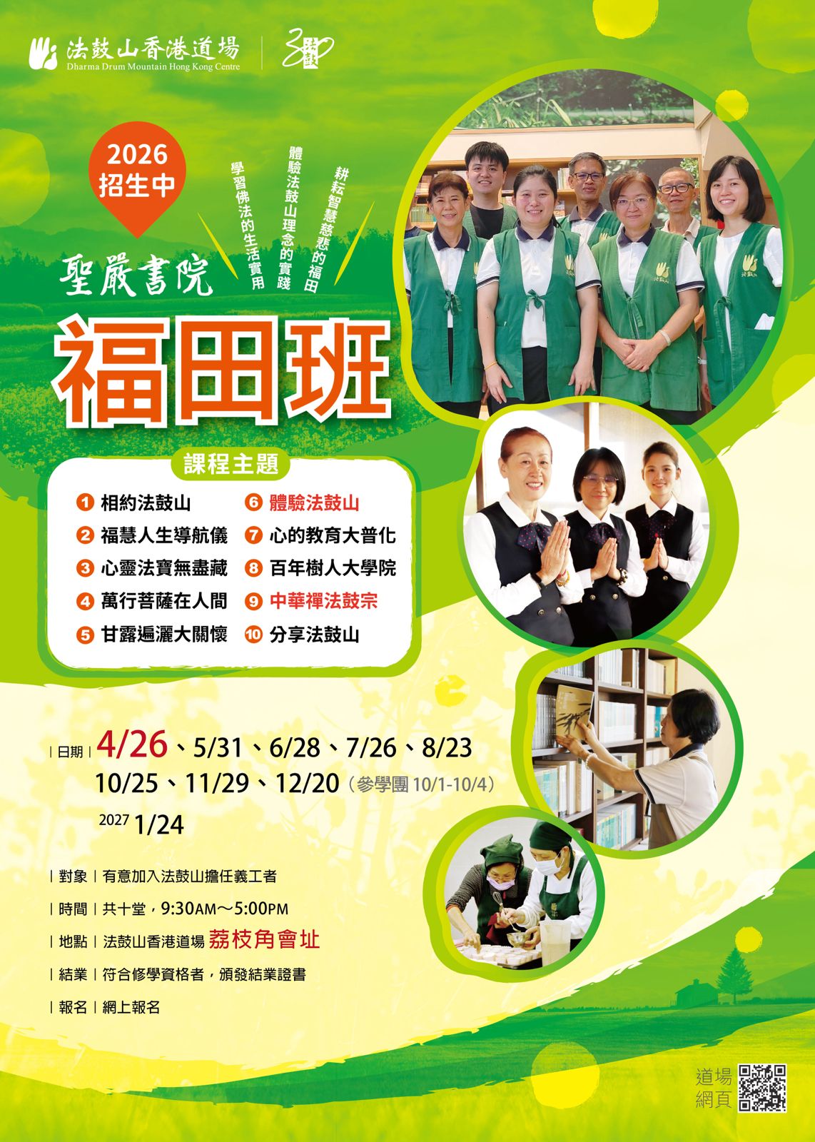 福田班是一系列十堂課,有系統地介紹法鼓山的理念及其他重要方向的課程。在這輕鬆的十堂課中,參加者將可以深入認識法鼓山,課程既重視傳授<解門>,更鼓勵學員實踐<行門>,精進修行,在生活中行出菩薩精神。