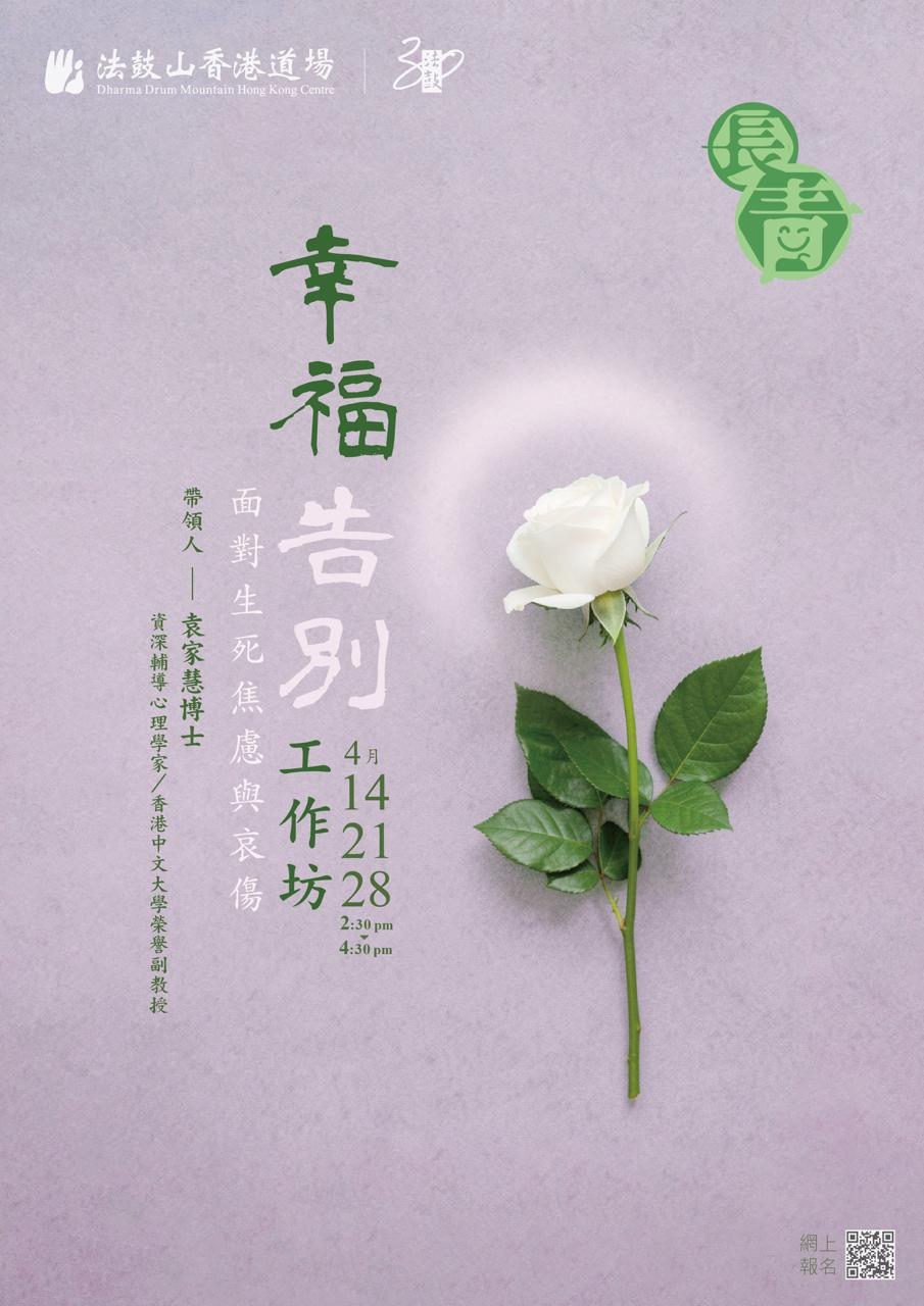 「給心靈一次深呼吸:在愛中與哀傷和解。」面對生命的終章,我們往往感到焦慮與無力。幸福告別工作坊:結合聖嚴法師的「心靈環保」與「心五四」智慧,並邀請輔導心理學家袁家慧博士帶領,透過三節課的輔導,讓我們走過哀傷的幽谷,學習「面對它、接受它、處理它、放下它」,在平靜中找回生命的韌性,優雅地與遺憾告別。