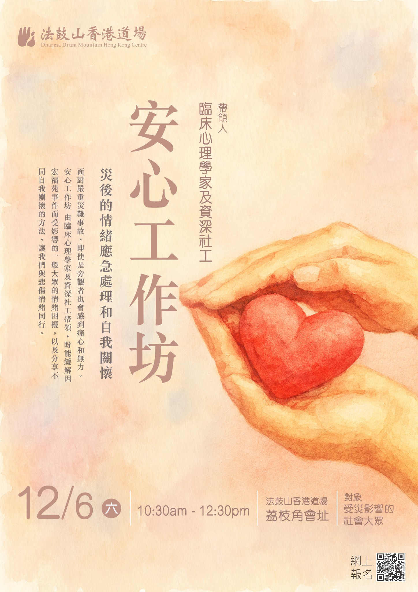 面對嚴重災難事故,即使是旁觀者也會感到痛心和無力。安心工作坊 由臨床心理學家及資深社工帶領,盼能緩解因宏福苑事件而受影響的一般大眾的情緒困擾,以及分享不同自我關懷的方法,讓我們與悲傷情緒同行。