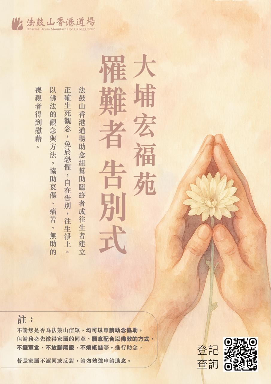 法鼓山香港道場助念組幫助臨終者或往生者建立正確生死觀念,免於恐懼,自在告別,往生淨土。以佛法的觀念與方法,協助哀傷、痛苦、無助的喪親者得到慰藉。