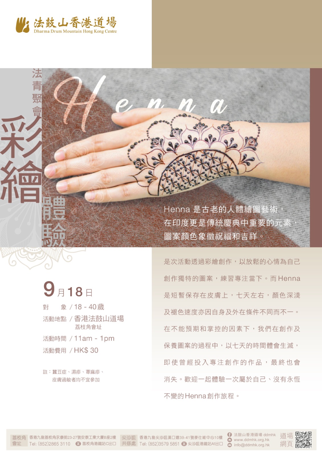 是次活動透過彩繪創作,以放鬆的心情為自己創作獨特的圖案,練習專注當下。而Henna 是短暫保存在皮膚上7天左右,顏色深淺及褪色速度亦因自身及外在條件不同而不一。在不能預期和掌控的因素下,我們在創作及保養圖案的過程中,以7天的時間體會生滅,即使曾經投入專注創作的作品,最終也會消失。歡迎一起體驗一次屬於自己、沒有永恆不變的Henna創作旅程。